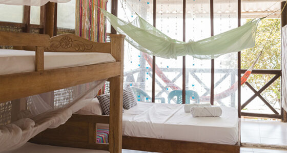 Habitación en el segundo nivel con cama doble y litera, frente al mar